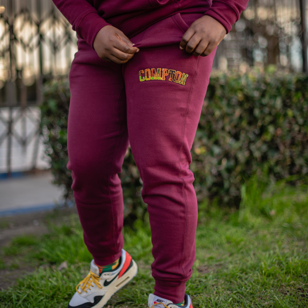 How do you say you're Black and from Compton without saying you're Black and from Compton? Show up in these jogger sweatpants with "COMPTON" stacked and embroidered with West African Kente cloth—that's how. Crafted with tackle and twill hand-laid embroidery stitching, these sweatpants embody comfort and cultural pride. Cozy and versatile, they pair perfectly with a Compton Soul hoodie, crewneck sweatshirt, or t-shirt.