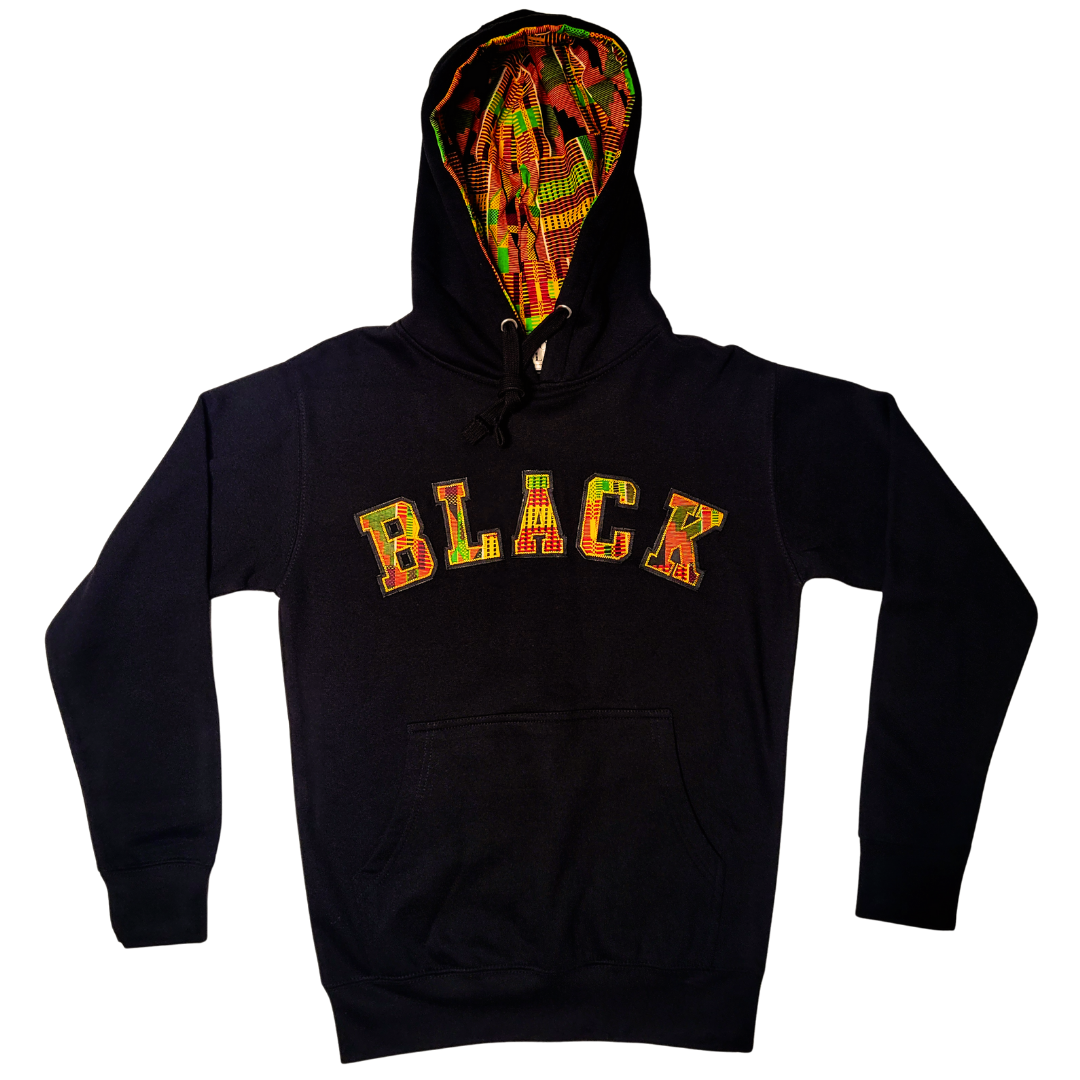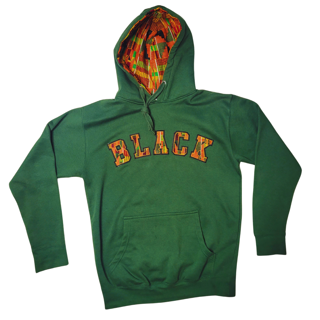Unapologetic. This hoodie does what it’s supposed to do. “BLACK” is embroidered across the chest in hand-laid Kente cloth — it is bold and rooted in culture. The hood is fully lined with mat Kente cloth print, giving it the chef's kiss.